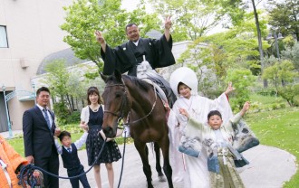 詳細を見る今回で2回目の依頼でした。 結婚式に馬を使いたい!というご要望にお応えして、陽炎さんで参加させていただきました。初めてお呼ばれしたときはウエディングドレスでしたが、今回は和装でし…