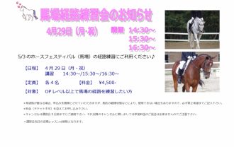 詳細を見る5月3日に行われるホースフェスティバル(馬場)の経路練習にご利用ください♪ 【日程】 4 月 29 日(月・祝) 【時間】 14:30~/15:30~/16:30~ 【定員】…