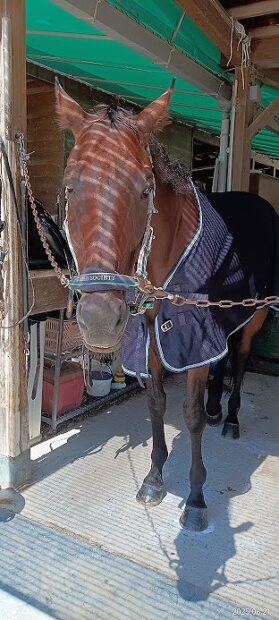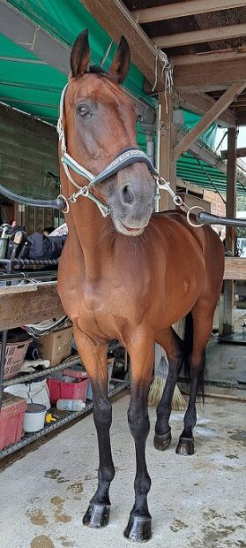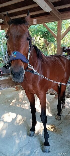| ホーストレックから転勤してきました。ご存知の方も多いようです。 競走馬としても有名だそうで、競馬に詳しい会員様に色々教えて頂きました。 https://jra.jp/JRADB/accessU.html?CNAME=pw01dud002007104901/A4菊花賞の動画も見せて頂きました。GIなので、色々有名な馬たちと一緒に走ったのですね。 3000mの長い距離で最後の直線までかなり大きく逃げている面白い展開のレースでした。 ほとんど2000m以上のレースばかり出ていたようなので、持久力がありそうです。 乗用馬としても歴が長く、ベテランの域に入ると思います。 歯の形状が特殊なので、頭絡をつける時はお口の形を確認してからそーっと入れてあげてください。 お砂糖を食べるのもちょっとどんくさいです(笑) |