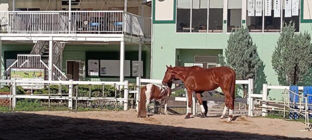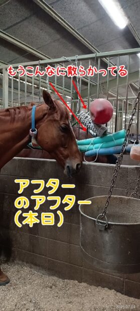 1鞍目は見ていたのですが、良い感じでまじめにやっていました。さて、プールバーで囲まれた馬房ですが、地道に破壊をこころみるせきトン。