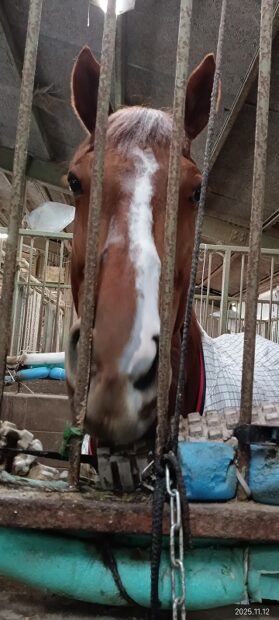 今の馬体の状態は来月あたりに撮影してみましょう。接してみると、実は人懐こい。でも、人見知りはするようです。