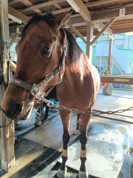 | 2022年2月2日に乗馬協会へやってきました。 名前は候補はいろいろありましたが最終的に響きの可愛い「つくね」になりました。 幼さが残る顔立ちで愛嬌もあり人気が出そうです。 動きは現状はまだまだ若いなーという感じですが、柔らかく弾むように動いてくれるので乗りやすいです。 メンタル的には落ち着いているので、最終的にはいろいろなクラスで活躍するオールマイティーな活躍を目指していますが、今は一日でも早く環境に馴染んでいろいろなことを覚えてゆっくり成長して欲しいなと願っています。 また皆様も洗い場で見かけたらほどほどに可愛がってあげてください。 |